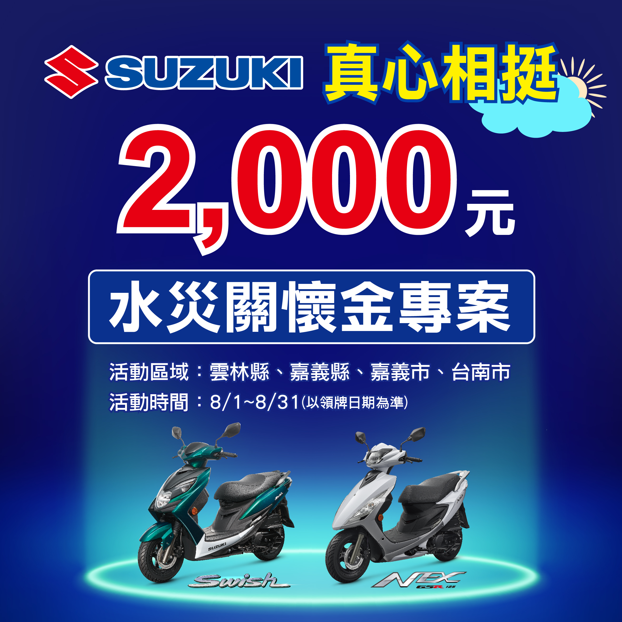洪災無情,SUZUKI 真心相挺,為了協助花蓮鄉親渡過洪災,撐過這段不容易的日子,除了原有購車優惠專案,推出花蓮關懷補助專案