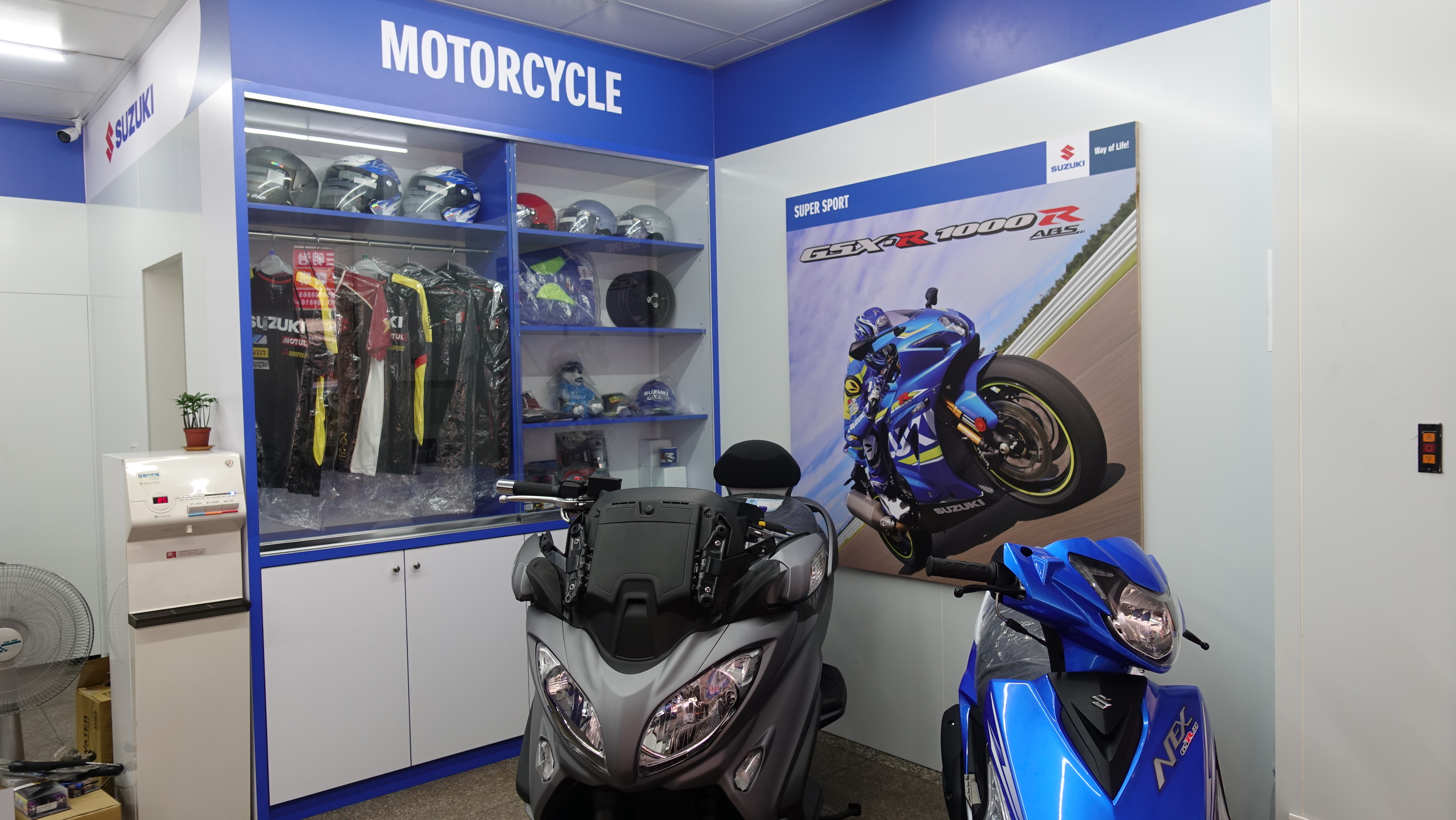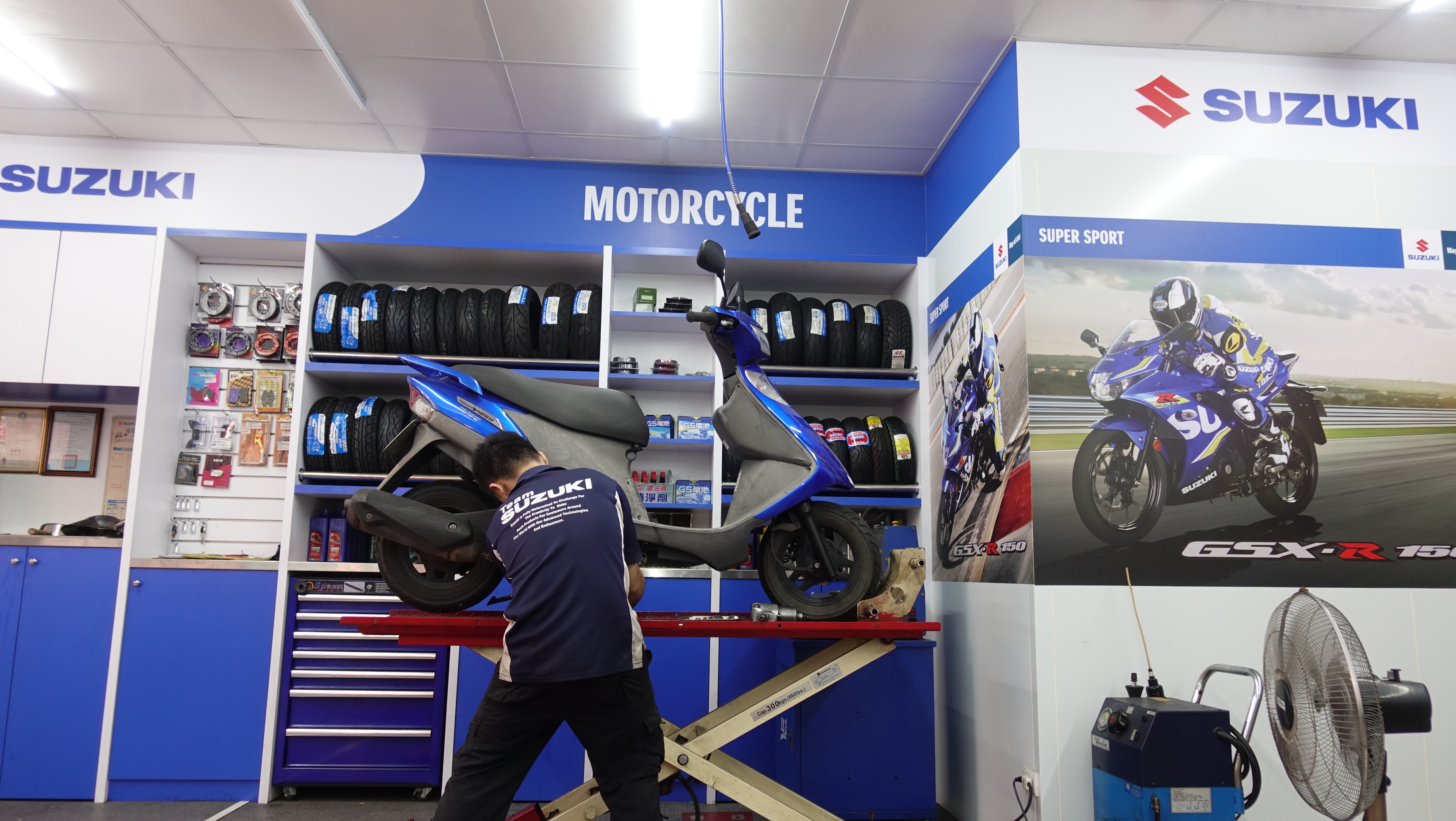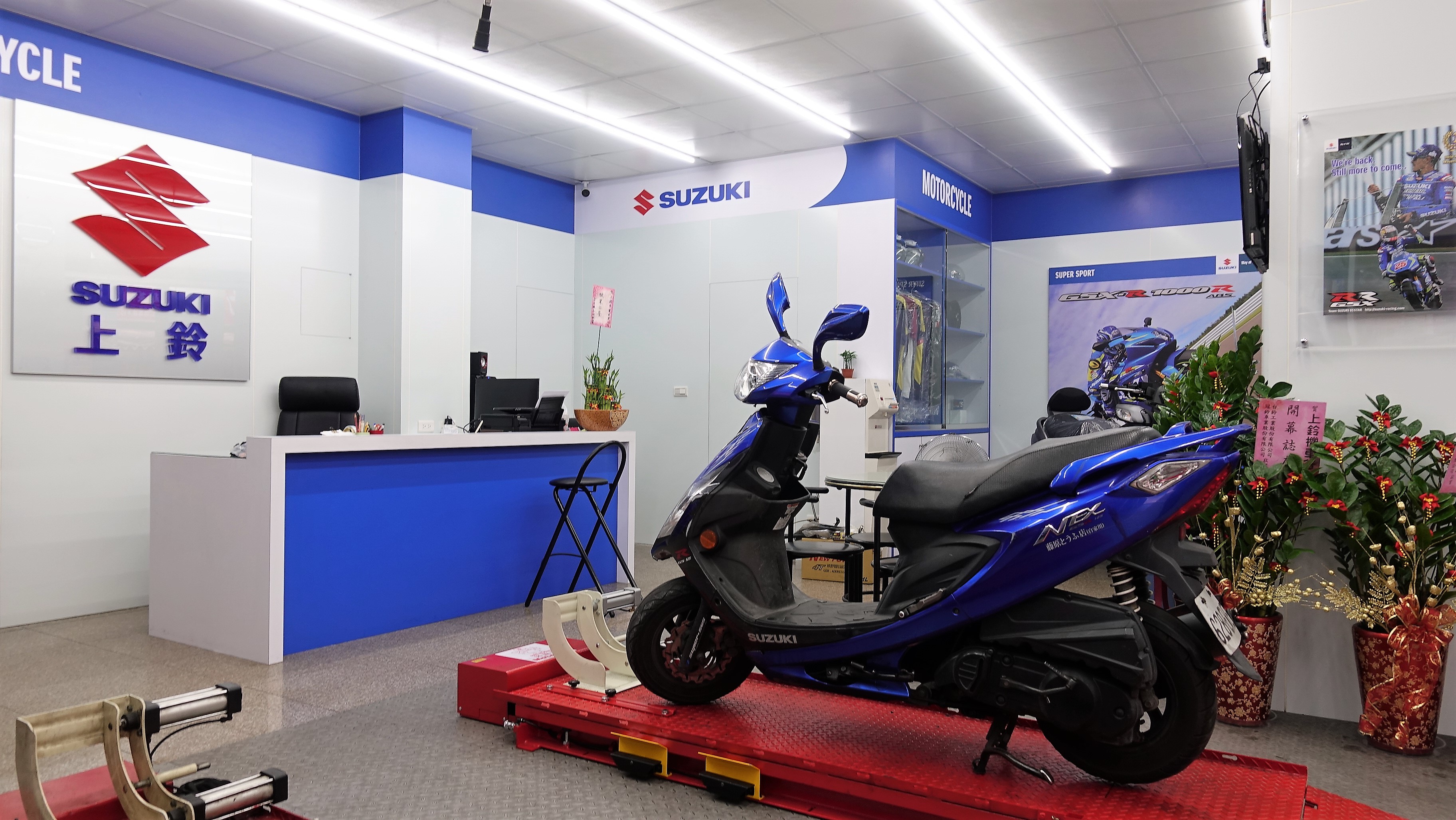 搭配寬敞明亮展示空間,除了展售全系列最新的SUZUKI機車之外,同時也銷售原廠進口精品,