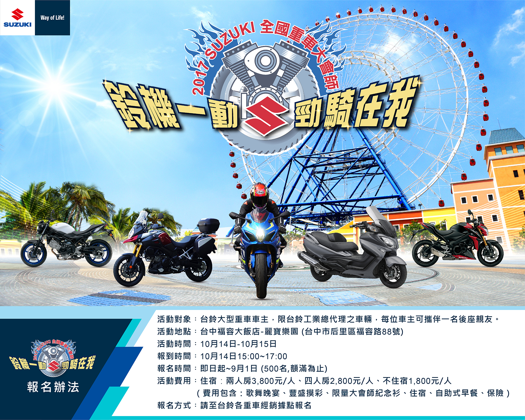 SUZUKI全國重車大會師開始報名囉! . 報名日期:即日起至9月1日 . 報名地點:https://goo.gl/hrcFMq (全國台鈴機車重車經銷商) . 報名表格:https://goo.gl/F41TRA (填寫後請至各區重車經銷商報名) 名額有限,加緊你的腳步趕快報名! 我們10/14~10/15 台中麗寶樂園福容大飯店不見不散喔!