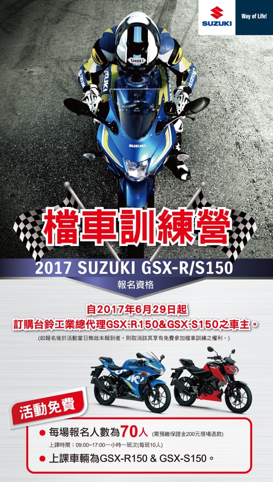 【2017 R150 & S150檔車訓練營!南部的同學~我們來囉!】 . SUZUKI檔車訓練營來囉! . (((((((((針對不會騎乘檔車的新手們)))))))))) . (一小時)的課程讓你學會起步、換檔與轉彎平衡。 上課車輛為GSX-R150 & GSX-S150 . ※12/09 in 台南 成功駕訓班 . 趕快來報名吧! 報名網址:https://goo.gl/UKjLFB ※需預繳保證金200元((現場報到退費))
