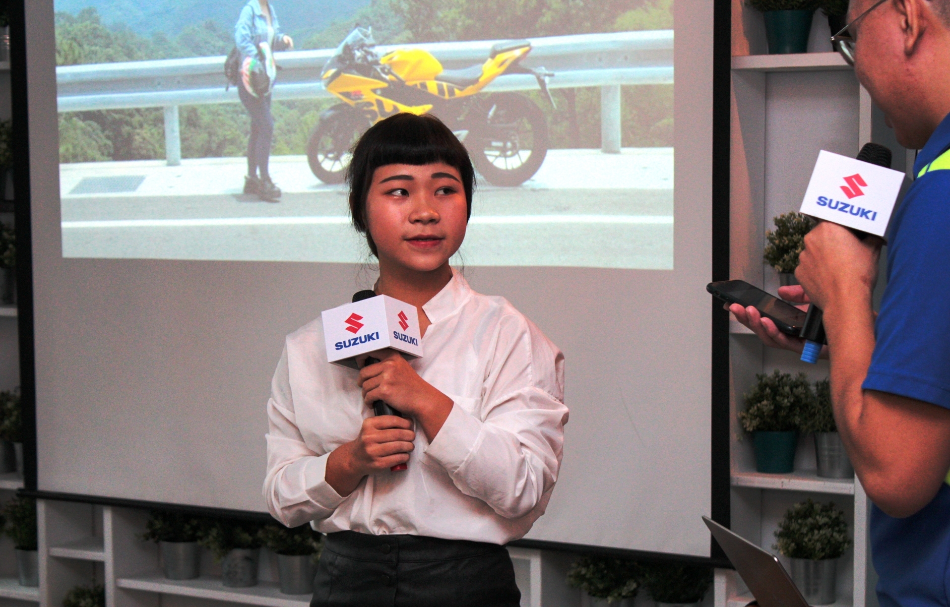 而另外一位女性車主嘉賓,則是身高153公分的帥氣女孩 陳昭妤小姐,則開心的說道:「因為朋友騎乘小阿魯,被GSX-R150帥氣的外型吸引,同時感受到SUZUKI經銷商的熱情與親切感,所以就買了小阿魯,就開始參與車聚活動,更認識了許多車友,開始了騎車出遊、跑山的騎士生活,這是以前從不曾有過的體驗,希望各位對GSX-R/S150小阿魯有興趣的女性朋友們,身高根本不是問題,有愛最要緊,不要怕,衝就對了。」