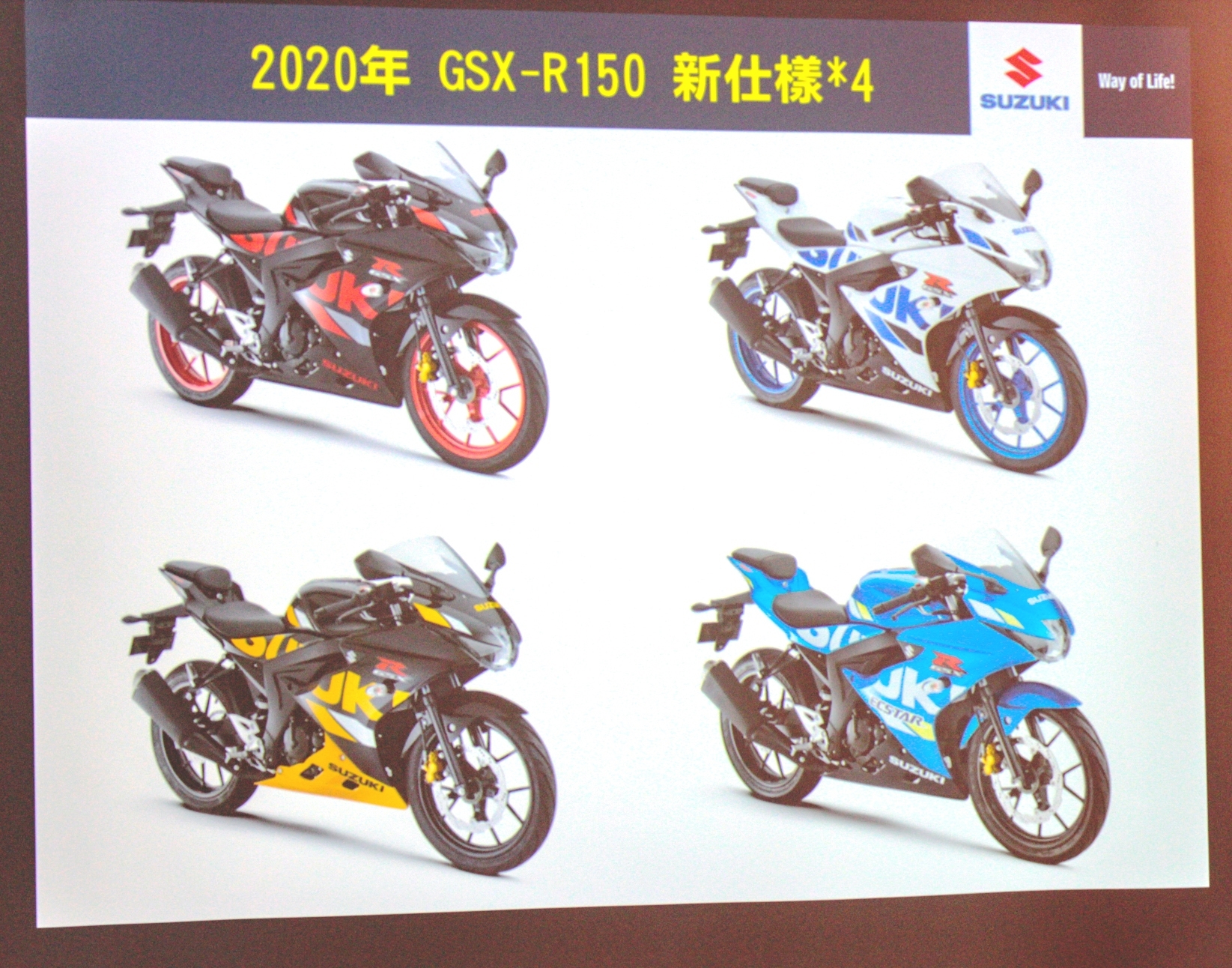 台鈴工業行銷課副理 李元鈞先生提及:「2020年全新GSX-R/S150 除了全新色彩外,更追加了全新配備,增加騎乘便利性與新潮酷炫感,GSX-R/S150 新增藍底高反差儀表及雙黃警示燈,而GSX-R150則追加Keyless 感應炫光環、金色塗裝卡鉗、與高質感鈦金屬色上三角台,提高給喜愛小阿魯的朋友們,高質感高價值感的絕佳感受。」