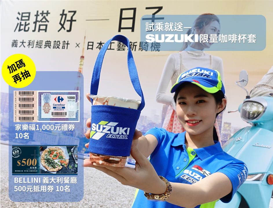試乘後填寫問券,即可獲得SUZUKI限量咖啡杯套一個