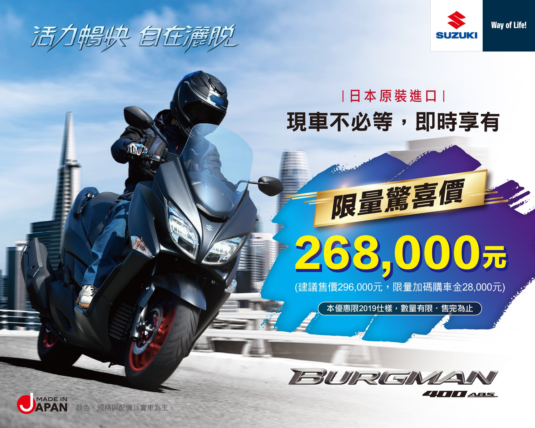 【即刻入主Burgman 400,限量驚喜價268,000元】 日本原裝進口Burgman 400 最潮運動跑旅,通勤出遊兩相宜 現在購車享限量驚喜價268,000元 讓你輕鬆擁有正日本製造的黃牌休旅旗艦