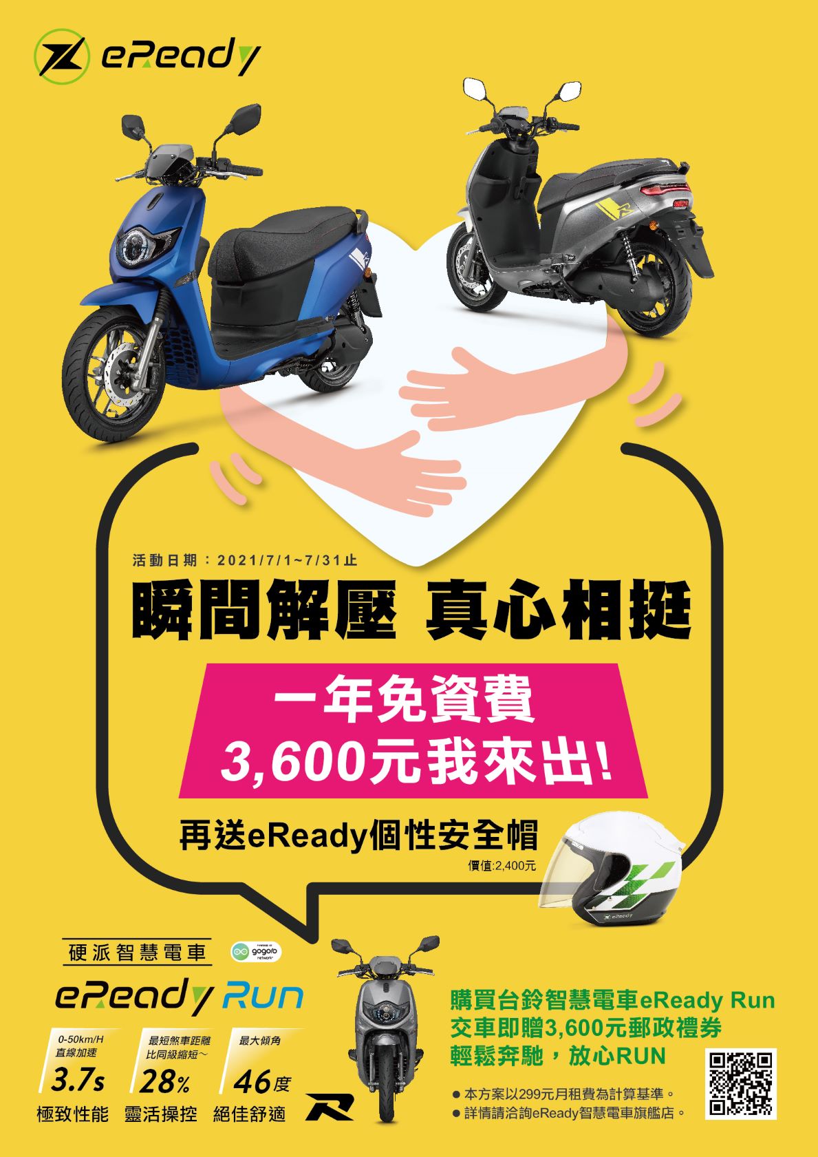 由台鈴工業打造的全新智慧電車品牌”eReady”,透過品牌、產品、店鋪、情感打造出不同於它廠的高質感、精緻路線,最新推出的eReady Run,融合台鈴造車40餘年的精湛工藝,加上日本重車概念的肌肉線條與運動元素DNA,淬鍊出硬派智慧電車,讓您Run大玩心;即日起至2021/7/31止,購買eReady Run,享”瞬間減壓,真心相挺”專案,購車即贈”3,600元郵政禮券”,與” eReady 個性風格安全帽”一頂(價值2,400元),讓您輕鬆購車,專心Run,詳情請洽eReady智慧電車旗艦店。