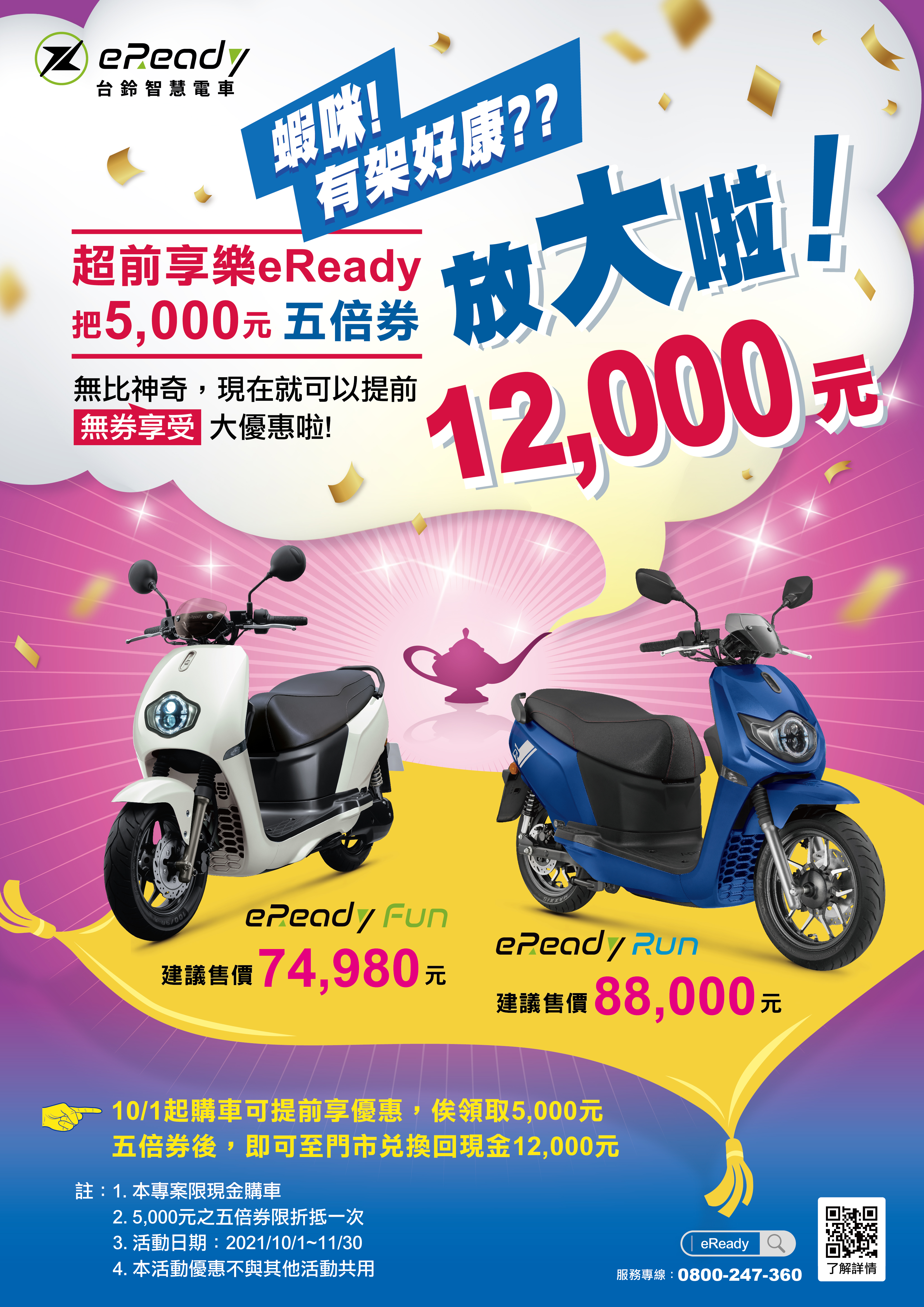 **最強的五倍劵加碼方案來啦~ 蝦咪! 有架好康?? 超神奇的eReady把5,000元變12,000元了~紮紮實實、落地有聲eReady直接加碼7,000元!! 凡持五倍劵至門市購車,即享5,000元變12,000元超強好康,現在更可以提前《無券享受》這項大優惠! 這麼神奇的好康,可得要相揪親朋好友一起來唷~