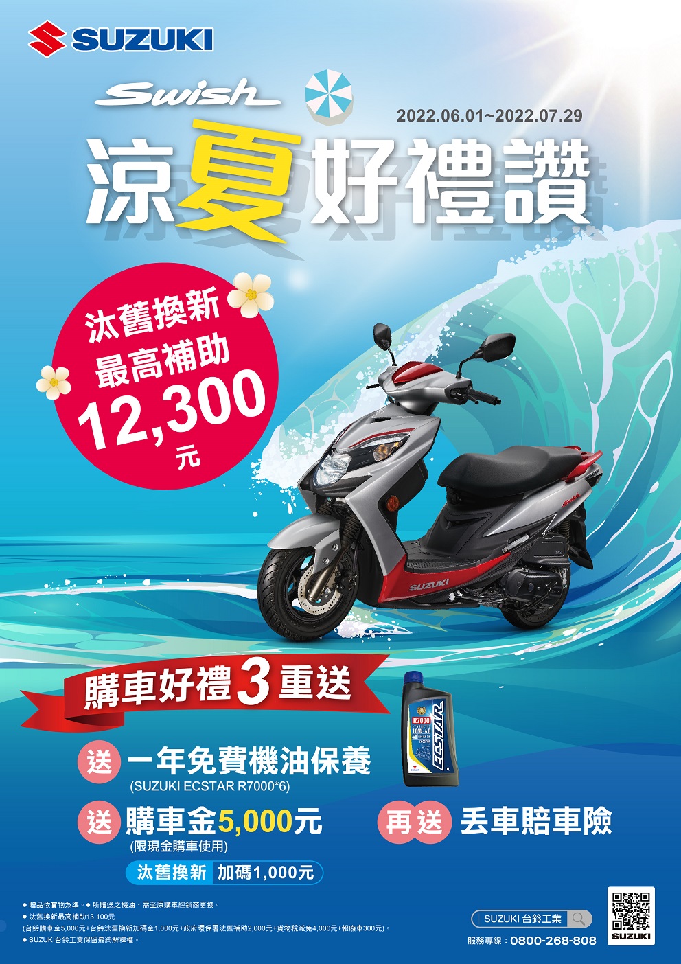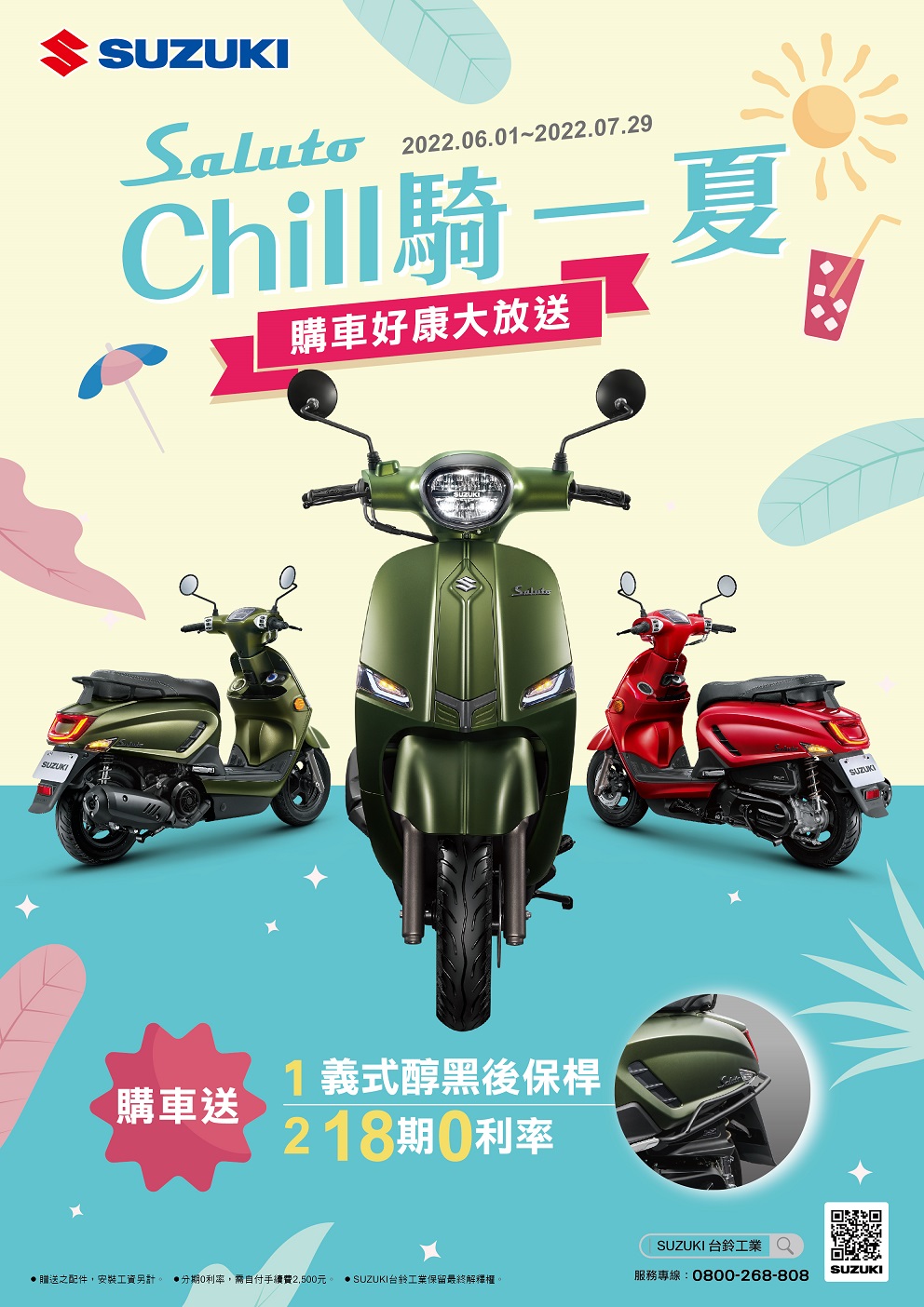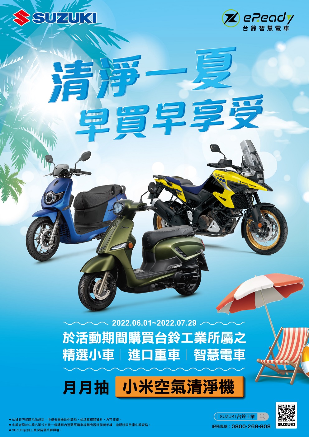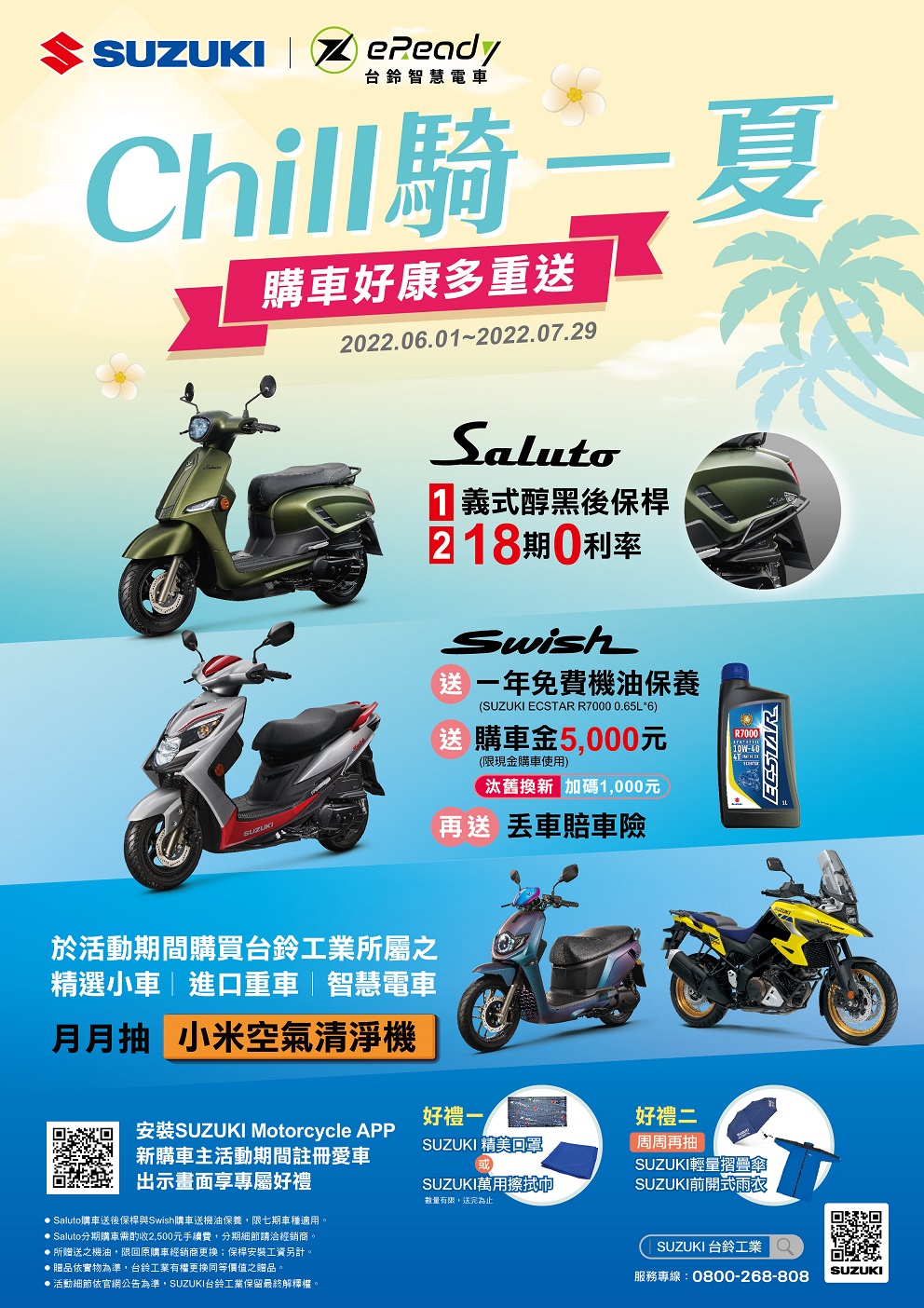 2022年6月1日–SUZUKI台鈴機車於2022年6月1日起,至7月29日止,推出『Chill一夏,購車好康多重送』專案,提供眾多機種購車優惠,除可獲得購車金、汰舊換新高額補助、精美時尚配件外,於活動期間購車,月月加碼抽小米空氣清淨機;新購車主下載SUZUKI Motorcycle APP註冊開通者,即可獲得原廠限量紀念品,周周再抽SUZUKI原廠精美摺疊傘、前開式雨衣,購車大利多,好康有夠讚。