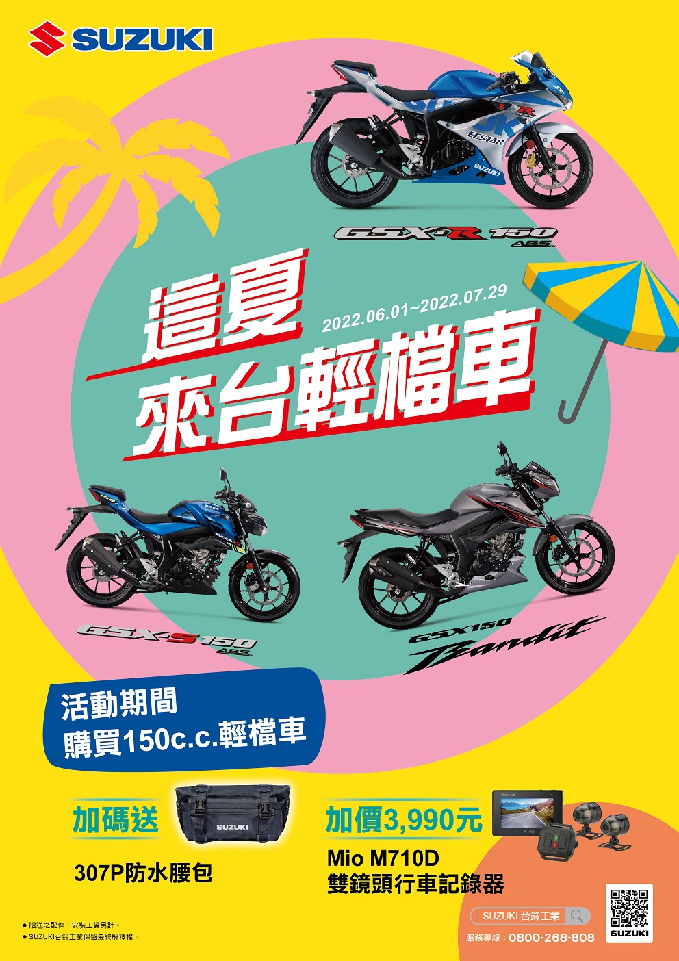 GSX-R150、GSX-S150、GSX150 Bandit,搭載150c.c.內同級車最大19.2P馬力,讓你暢快奔馳,盡享速度快感;現車不必等,快速交車立馬暢騎;於活動期間購買GSX-R150、GSX-S150、GSX150 Bandit,加碼贈送307P防水腰包;加價購3,990元,即享原價6,290元的MIO M710D前後雙鏡頭行車記錄器,讓你安心騎乘,瞻前顧後。