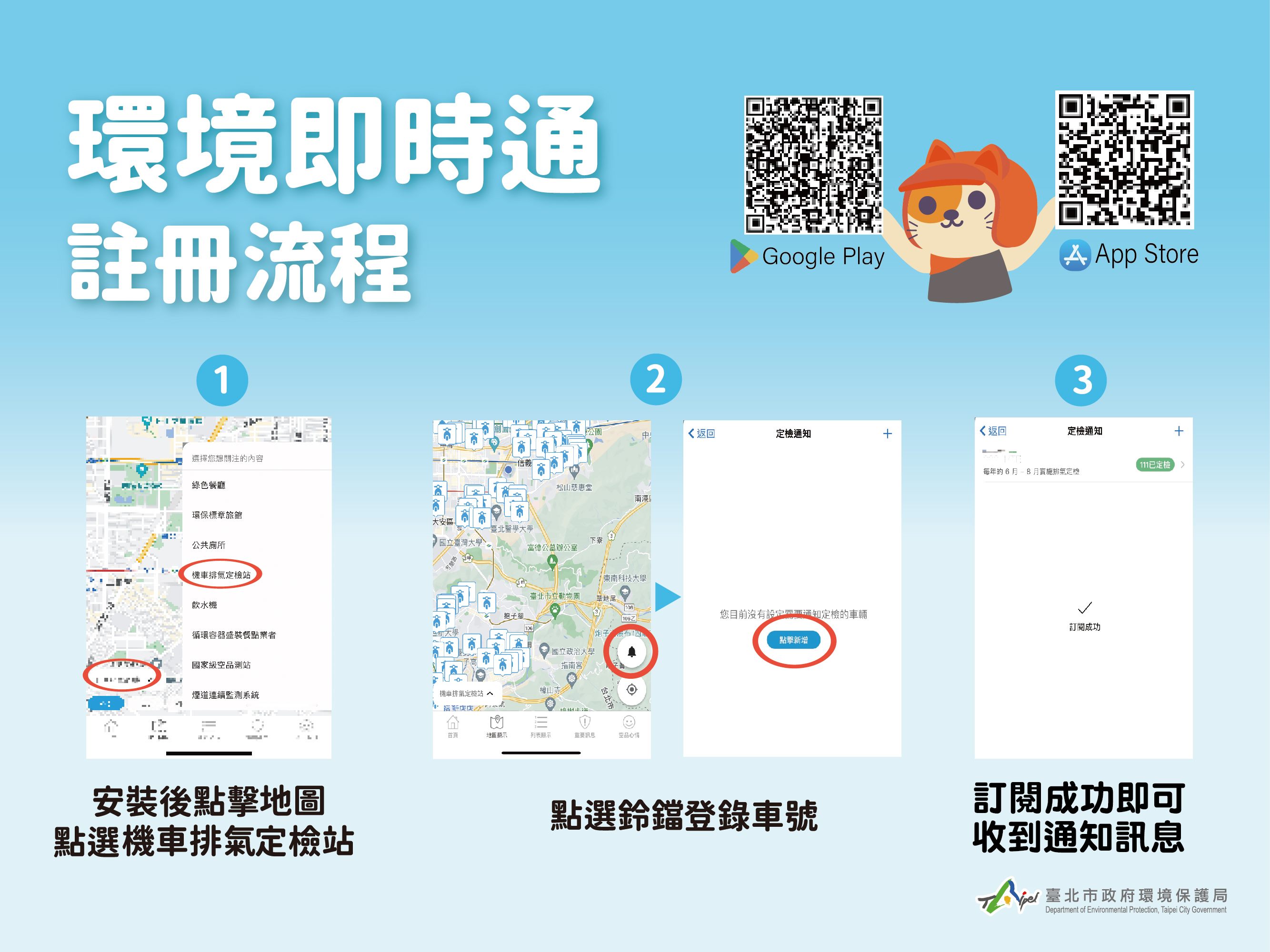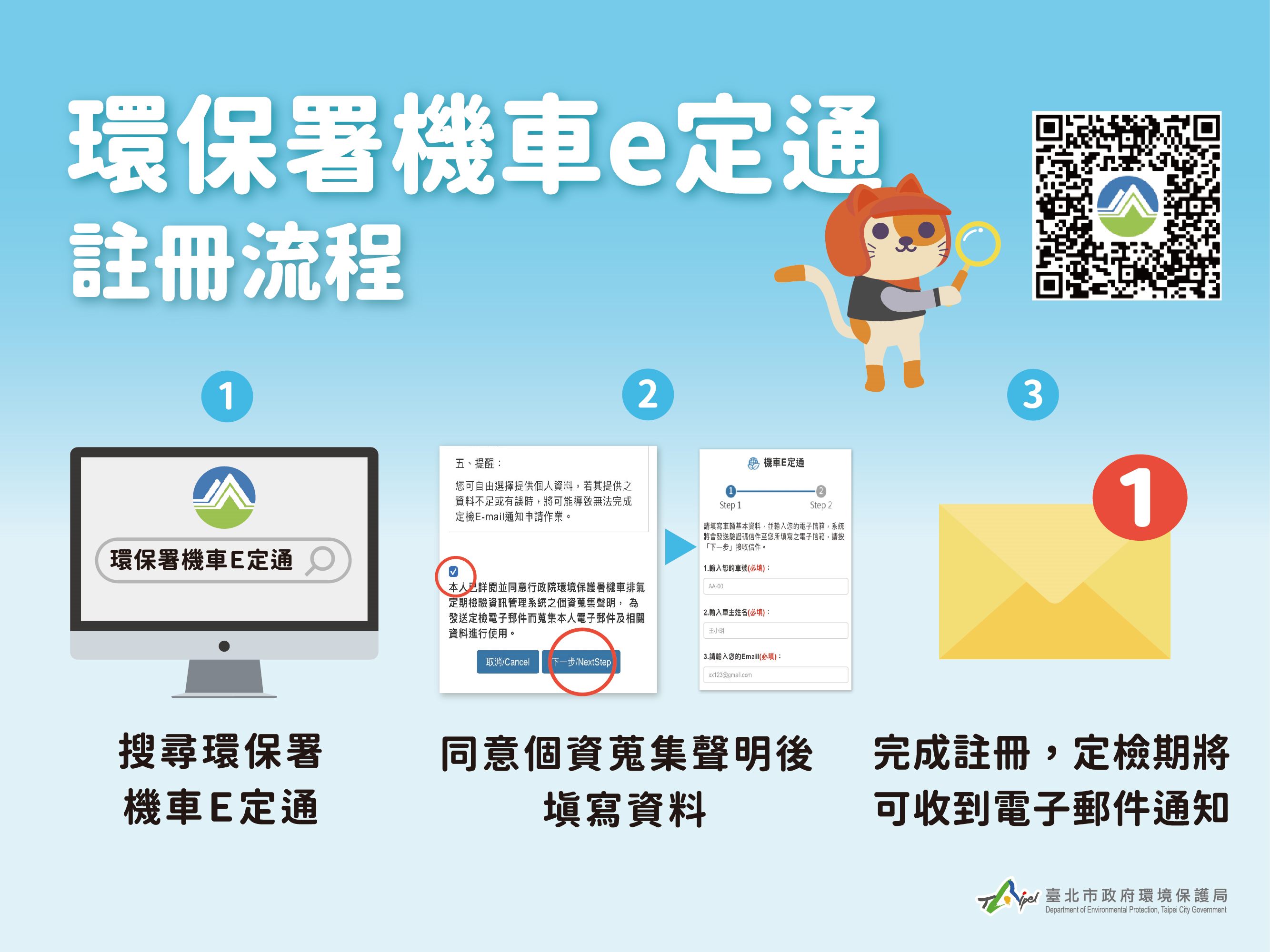 臺北市機車排氣定檢通知將自今(112)年7月1日起全面電子化,環保局推出定檢通知電子化入門懶人包,教導民眾3種e化通知方式,簡單幾個步驟就可以完成註冊,方便民眾快速上手,定檢通知不漏接!