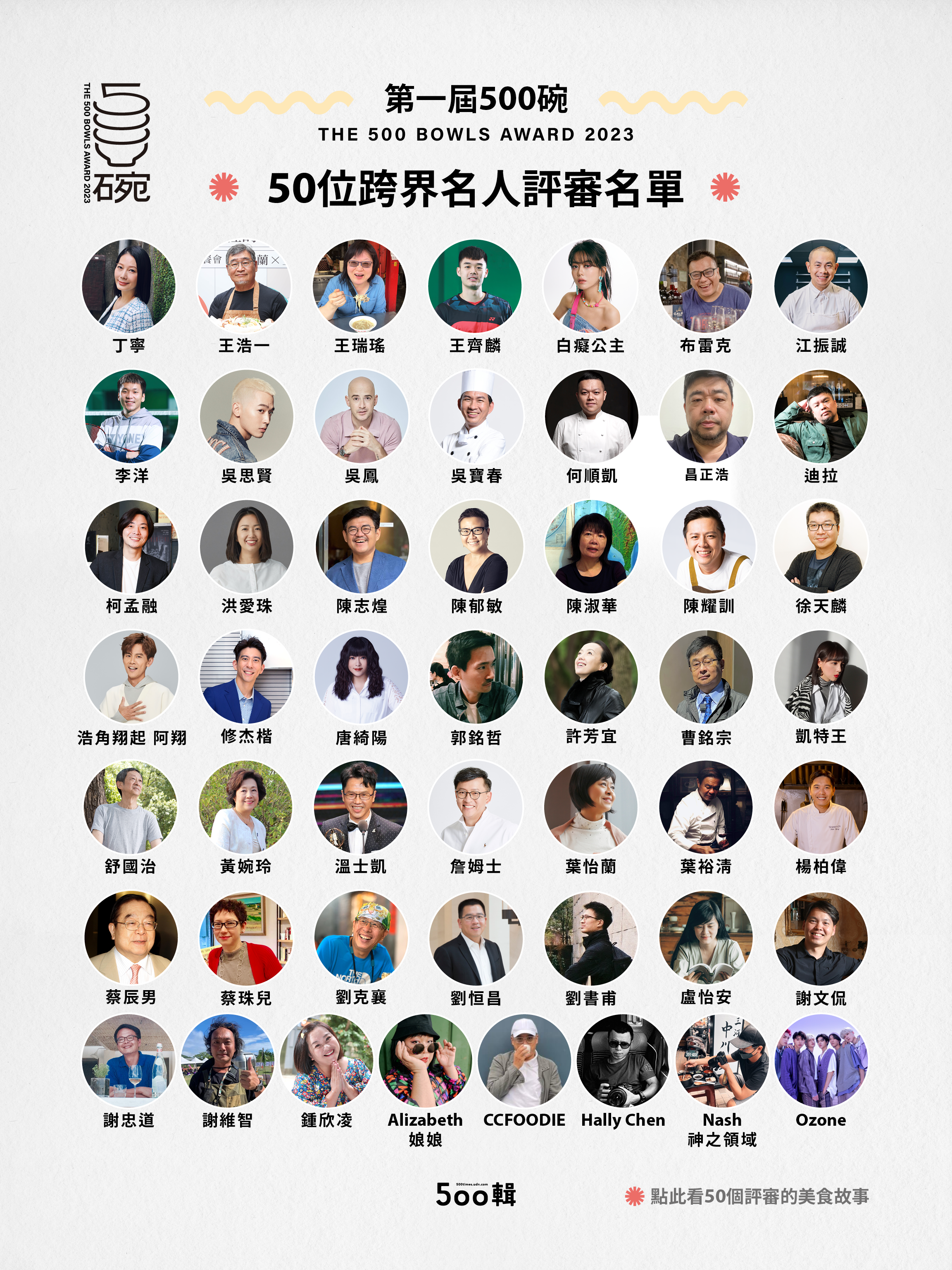500碗評鑑廣邀50位各行各業的名人擔任評審,邀請名單上相較500盤更加廣納不同專業類別,除了名廚與美食家,人氣YouTuber和部落客也是重要亮點;並透過500輯的媒體觀察,找來許多醉心小吃的藝人、作家或產業工作者,每人選出讓他們心悅誠服的十道小吃給碗。評審之一、奧運羽球雙打金牌得主李洋分享:「我超愛小吃的,簡單來講,麵食、甜食、炸物、肥肉、花生粉、勾芡⋯⋯所有會胖的東西,我都很愛。到目前為止,我還沒在會讓人發胖的東西裡面,找到我不愛的。」