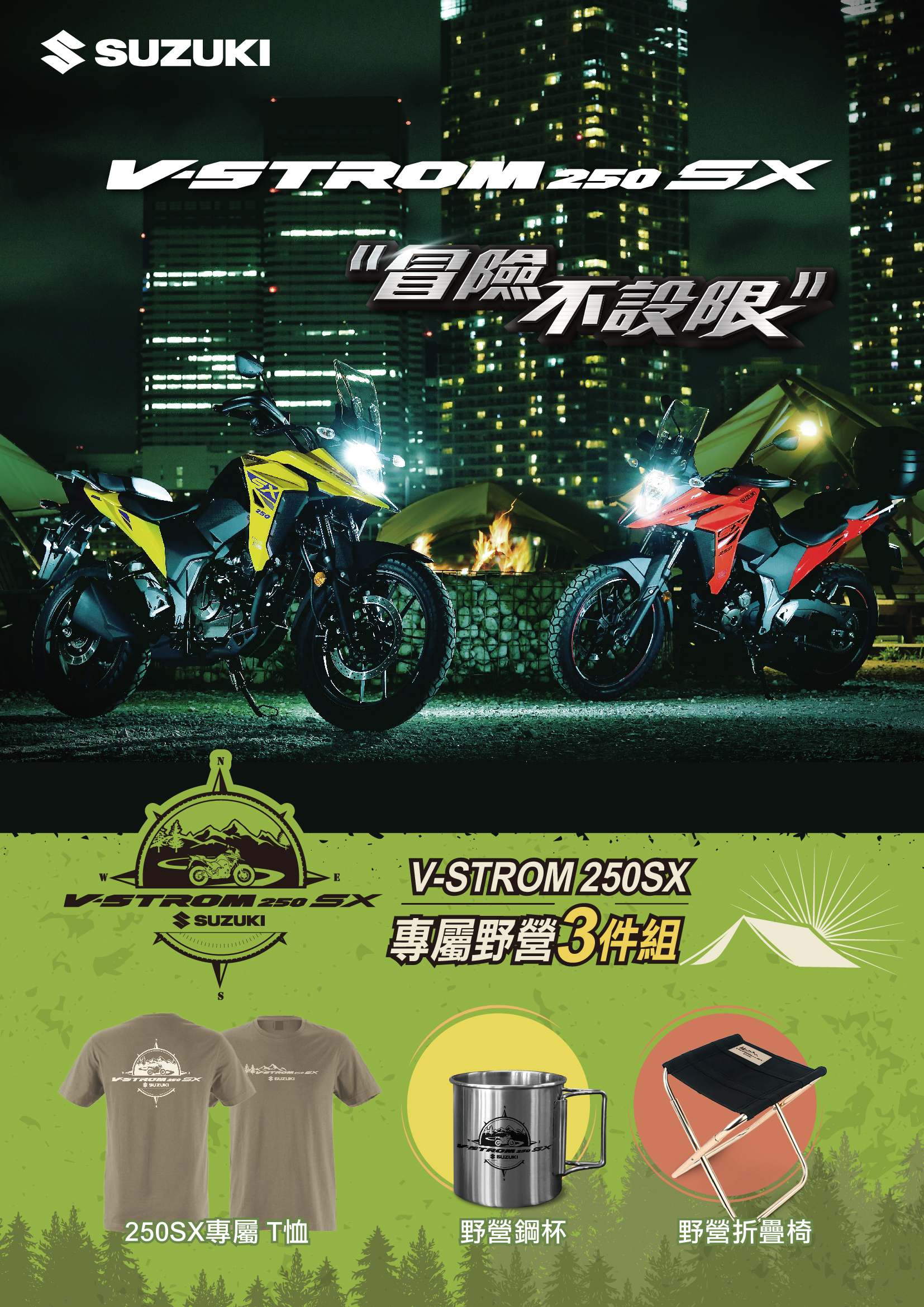 V-STROM 250SX 第二波預購即刻開始,現在預購明年度車輛,就送專屬V-STROM 250SX 野營三件組!