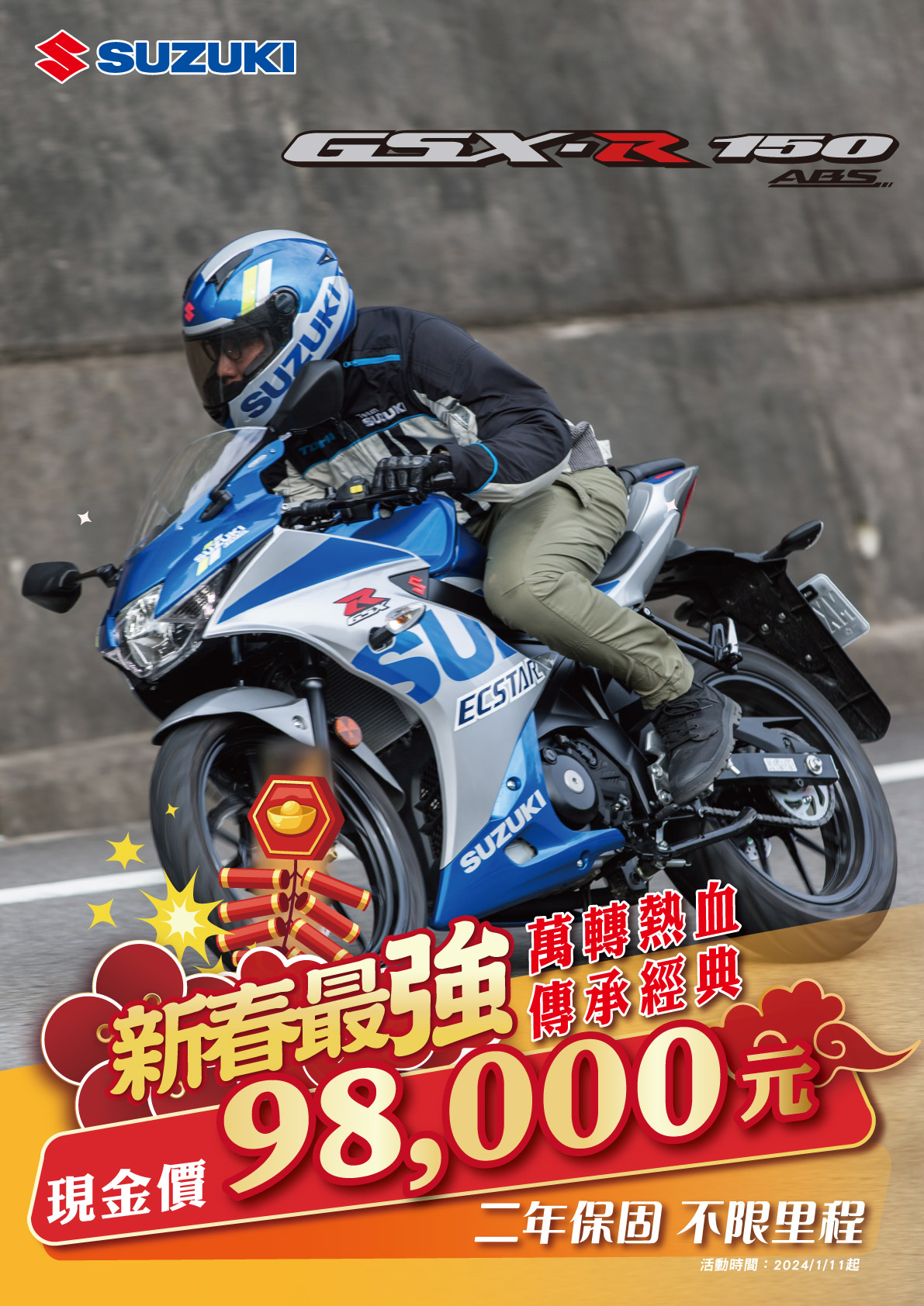 1. SUZUKI GSX-R150新春優惠價格為98,000元(不含牌險)。