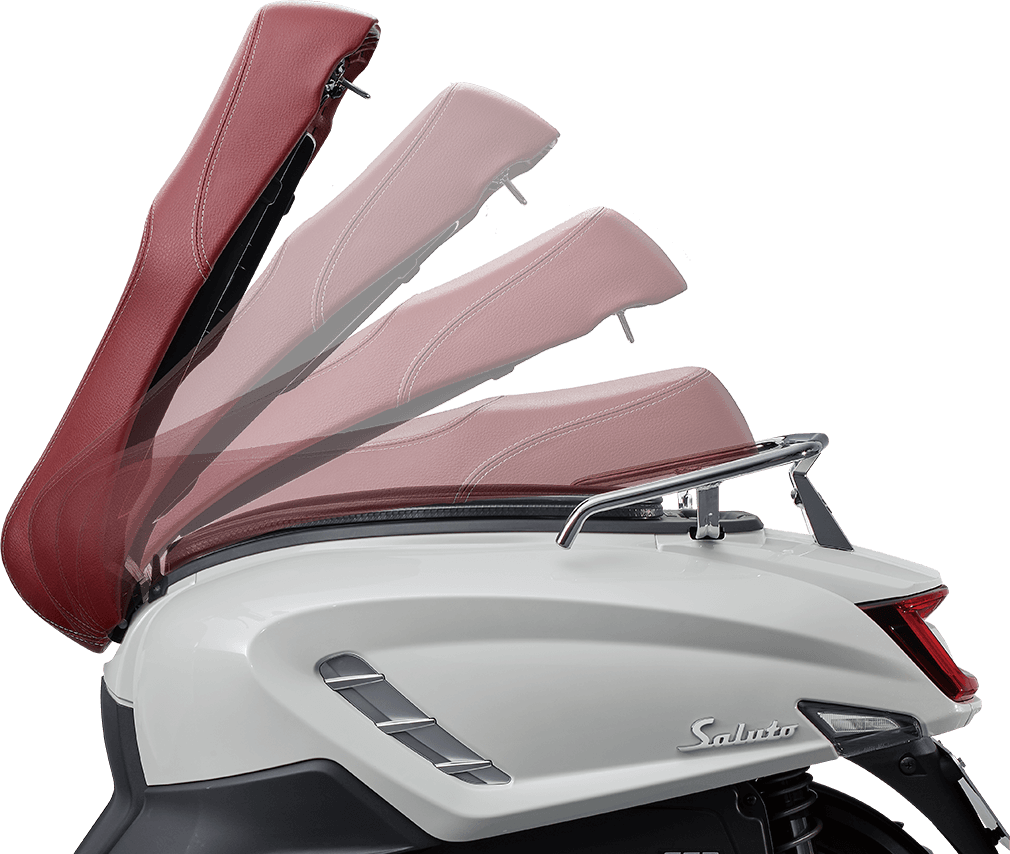 Saluto 坐椅設計回歸義式機車經典線條,雙車縫線坐椅一如古著精品,搭配環抱式鍍鉻尾架,摩登又復古,經典又時尚。