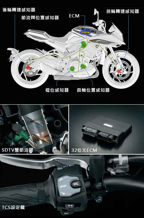在行駛時TCS將會以250次/每秒的頻率對全車5大感知器進行偵測,在偵測到後輪的高速空轉時,ECM將會利用點火正時控制之方式限制出力,讓後輪維持足夠的循跡性,並減少騎乘者因系統介入而產生的不自然操駕感,這樣的技術來自於 SUZUKI 參加 MotoGP 賽事所得到的技術回饋,不僅能有效提升行車安全,也兼顧了操控的樂趣。